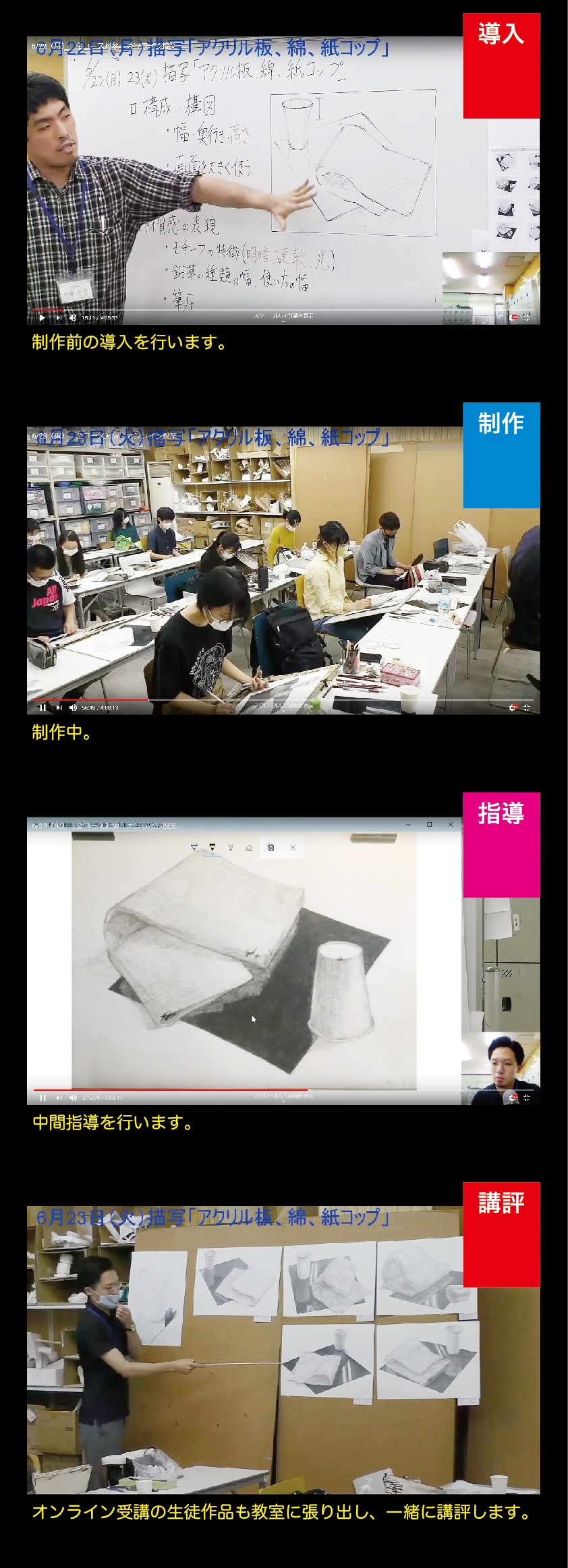 - ・オンライン授業生も、導入~講評まで教室受講生と同じ時間帯で受講します。